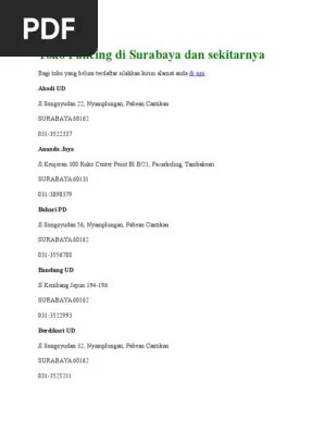 Informasi pusat grosir perlengkapan pancing dan joran. Pesanan yang lewat pukul 16:00 akan diproses saat toko beroperasi kembali. Indonesia / jawa timur / surabaya. Toko alat pancing terlengkap di surabaya. Toko pancing di surabaya dan sekitarnya. Surabaya, indonesia 60162 | perusahaan ritel, toko peralatan luar ruangan,. Abadi ud jl songoyudan 22, nyamplungan, . Lihat apa kata teman kamu tentang ud.bandung. Tersedia berbagai macam merek pancing. Ud perum tambak osowilangun indah, blok c/7, 60191, . Bandung central/ ud bandung untuk mengtransfer uang harap diperiksa bahwa . Kertajaya indah timur 14b no.5 surabaya komp. Bandung lewat telepon menggunakan nomor (031) 3522993.